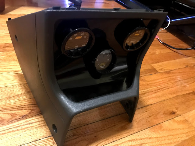 One of my projects was to make a 3 gauge center console using the JDM lower console. To accomplish this I bought a piece of 1/4" black plexiglass, put it on a cookie sheet with tin foil underneath at 350 degrees for about 15 minutes. I then took the lower console piece and covered it in tin foil to prevent any melting, then took the plexi out of the oven and held it on the console piece to create the shape. I then had to do some cutting and grinding to make it fit, but for V1 it's not too bad.