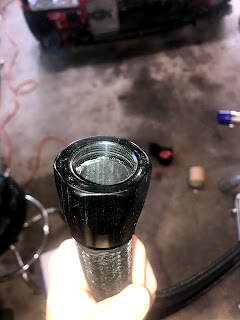 Saturday I took the day off and did yard work but today I made some progress on the coolant lines. I had ordered some AN16 lines and connectors and went to work trying to make it work. With the coolant nozzle options for the head I don't have a lot of choices so I had the AN16 bung welded onto the nozzle. I would have liked it closer, but it is what it is.