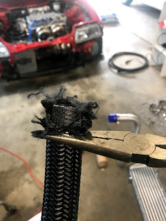 Step 2: use a needle nose to roll the nylon off the hose down about 1". That seemed like a good distance for the AN16, the AN10 ended up being about .75". After you pull it back cut away as much loose nylon as you can.