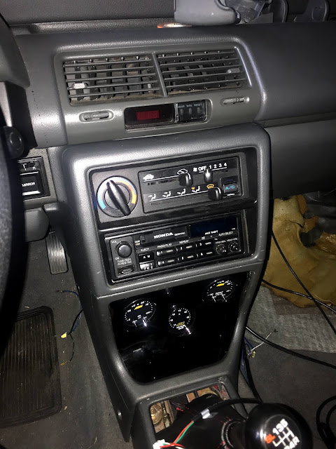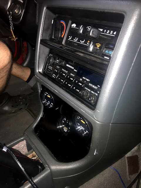 Friday was running gauge wiring through the firewall, pulling the ECU to solder in the components for the Hondata boost controller and pulling the CD player from the lower part of the console. I'd like to put the gauges here and I have an idea how to do it.