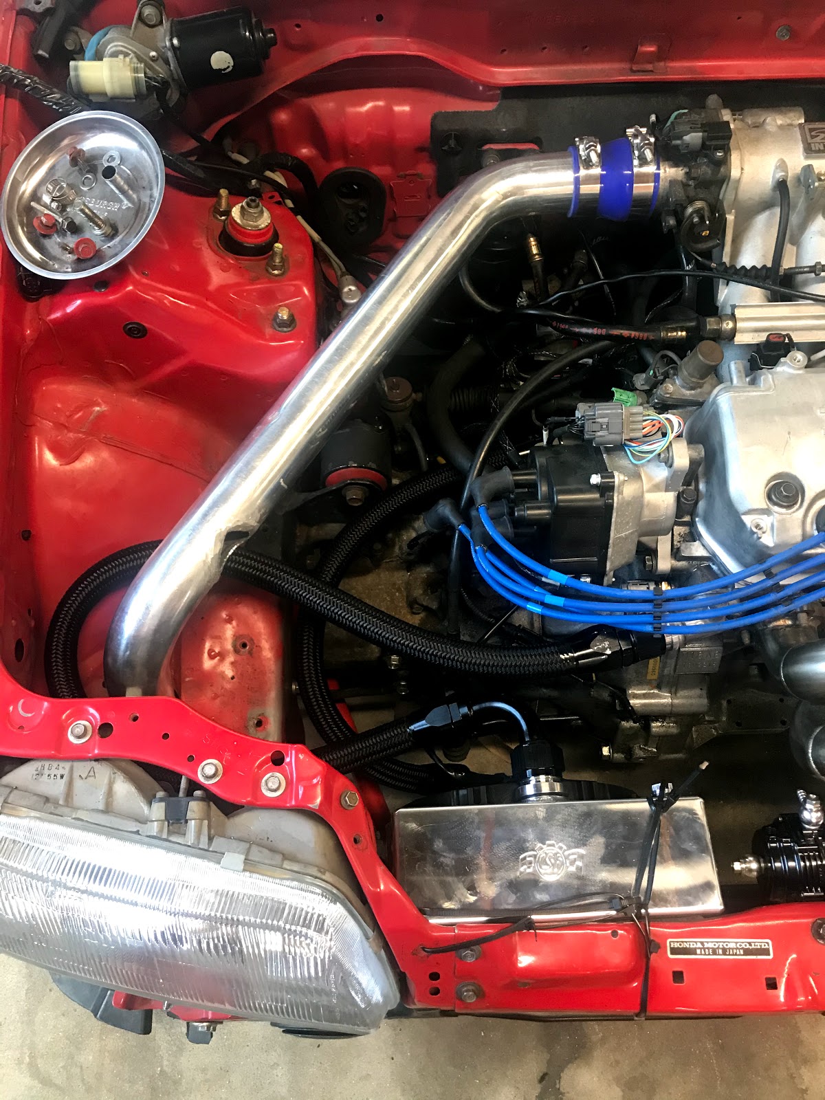 So the AN10 bungs and header are done and I did some mock up last night using the downpipe I had handy. It's still tight and I will 100% need a custom radiator at some point. Right now the Mishimoto EG will have to do the gangster lean.
